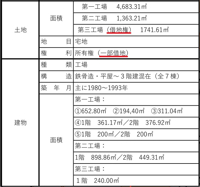 ・土地は第三工場の土地が借地権で、土地面積には借地の面積(1741.61平米が含まれています) ・第一工場の土地:4683.31㎡ ・第二工場の土地:1363.21㎡ ・第三工場の土地(借地権):1741.61㎡